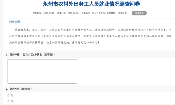 為了解全市農村外出務工人員就業情況,聽取群眾對人社工作的意見建議,永州市人力資源和社會保障局于5月12日至5月30日組織開展了“農村外出務工人員就業情況”調查征集活動。