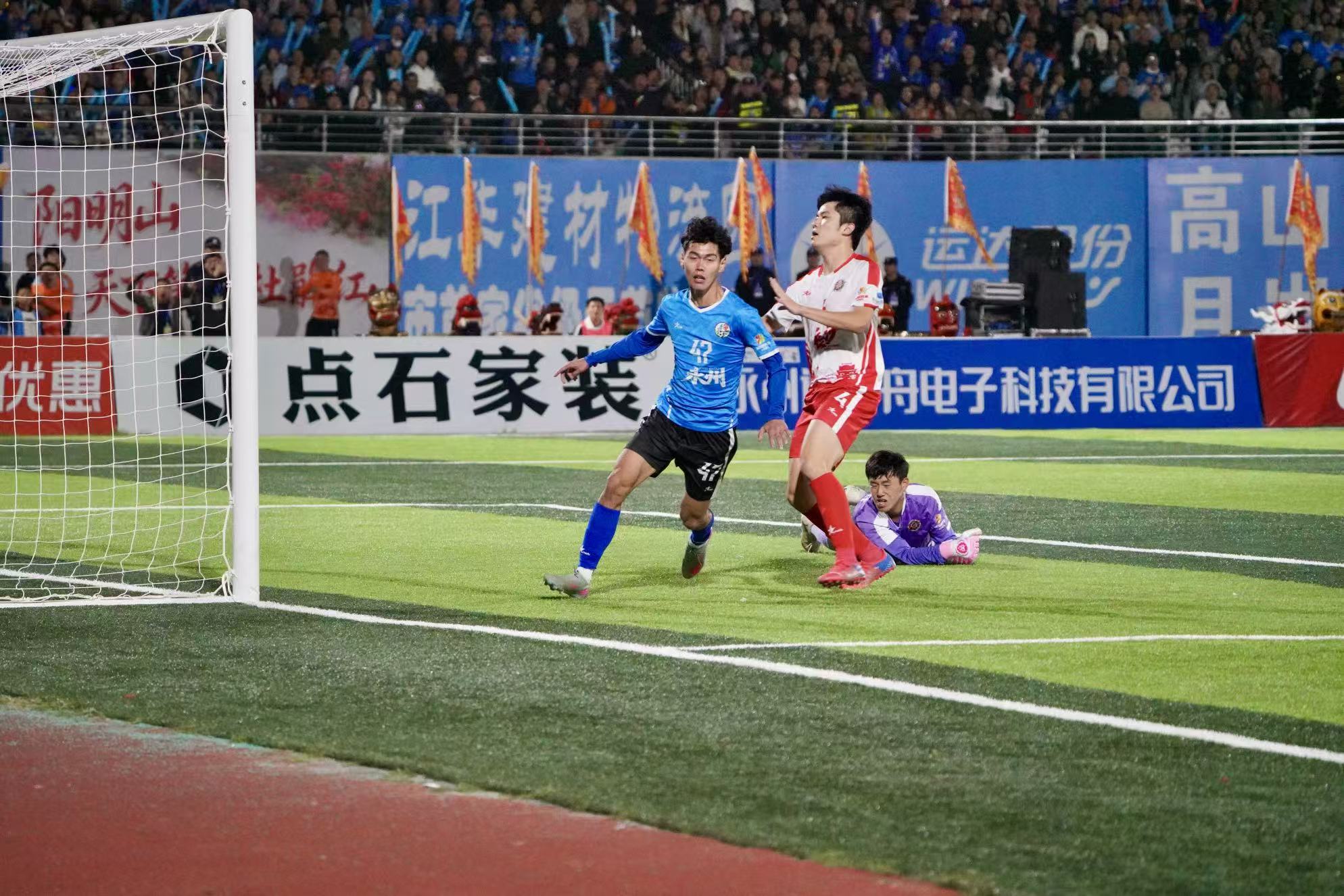 下半場易邊再戰,長沙隊換人繼續加強進攻。面對對手的猛烈攻勢,永州隊依靠穩健的防守和頑強斗志,多次化解對手攻勢,其中門將成為球隊防線的“定海神針”,多次上演高接低擋的精彩表現。隨著比賽進行,雙方攻防轉換節奏加快,拼搶十分激烈。比賽進行到第79分鐘,下半場替換上場的長沙隊66號譚想一記頭球攻破永州隊大門,將比分扳平。比賽第81分鐘,長沙隊在禁區外的一腳遠射擊中橫梁彈出。補時階段,雙方都未能把握住機會再次破門。最終,全場比賽結束,永州隊1:1逼平實力更強的長沙隊。