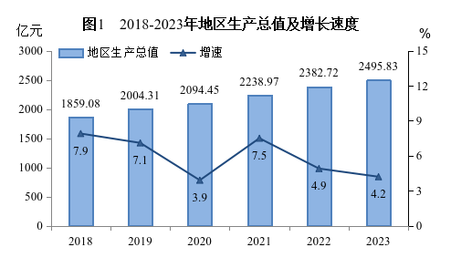 根據地區生產總值統一核算結果,全年全市實現地區生產總值2495.83億元,同比增長4.2%。其中,第一產業441.54億元,增長3.9%,第二產業809.54億元,增長2.7%,第三產業1244.74億元,增長5.3%。按常住人口計算,人均地區生產總值48165元,增長5.4%。