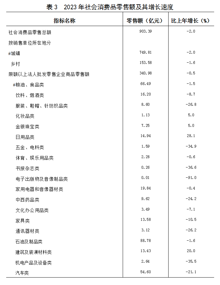 全年社會消費品零售總額903.39億元,比上年下降2.0%。分經營地看,城鎮消費品零售總額749.81億元,下降2.0%;鄉村消費品零售總額153.58億元,下降1.6%。
