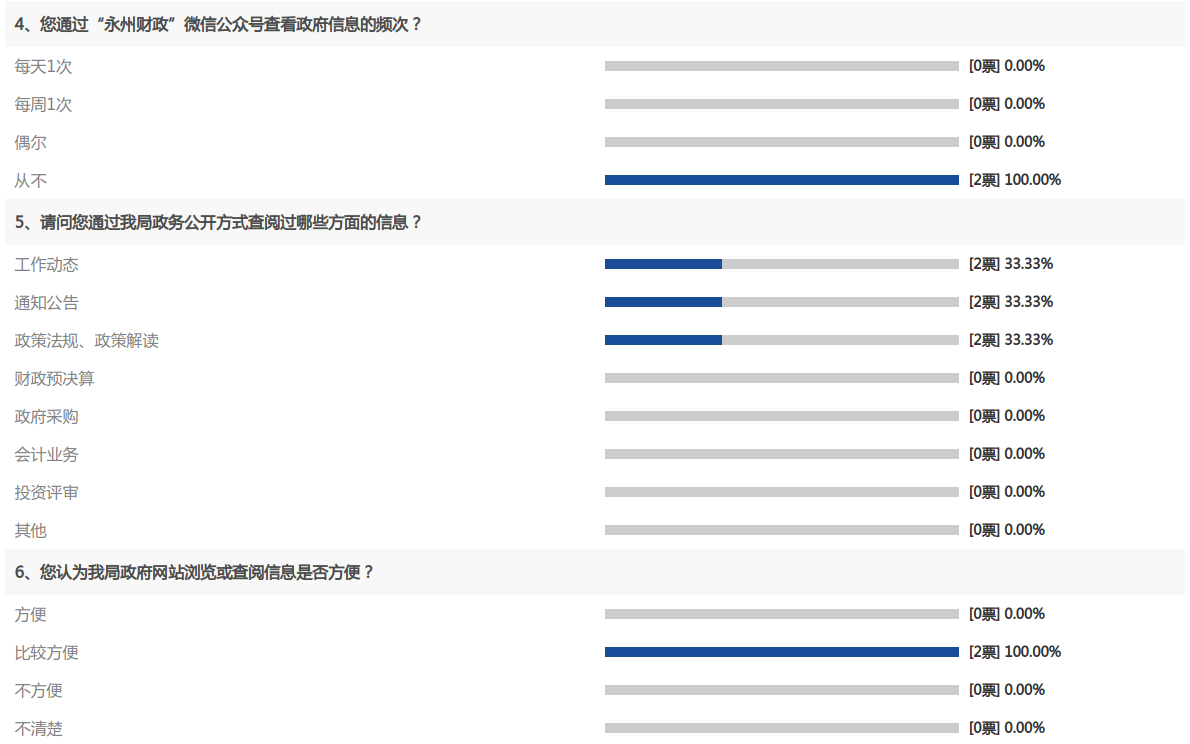關于永州市財政局政務公開的調查問卷自2024年6月17日開始,至2024年7月26日結束,投票人數2人,具體情況見下圖統計: