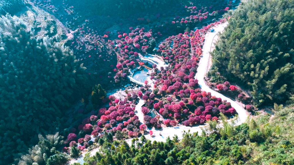 入冬以來(lái),湖南省永州市持續(xù)多日晴好天氣,溫暖的陽(yáng)光下,自然山水呈現(xiàn)出豐富多彩的生態(tài)美景。不少游客走進(jìn)鄉(xiāng)村,欣賞紅楓、銀杏等,帶熱鄉(xiāng)村旅游,促進(jìn)當(dāng)?shù)厝罕娫鍪铡? 位于永州市藍(lán)山縣湘江源瑤族鄉(xiāng)坪源村的藍(lán)山谷景區(qū),自11月下旬以來(lái),景區(qū)內(nèi)打造的紅楓群進(jìn)入最佳觀賞期。火紅的楓葉綴滿枝頭,在峽谷地帶延綿5公里。從天空俯瞰,一簇簇紅楓在青山綠水間別具一格、分外好看。 “趁著晴好天氣,和幾個(gè)朋友一起來(lái)這里拍照游玩。紅楓真的太美了,就像走進(jìn)了童話世界。”和好友自駕來(lái)到坪源村的廣東游客張蓓說(shuō),“和我們一起進(jìn)村的還有旅游大巴、摩托車隊(duì),大家賞楓的熱情非常高。”