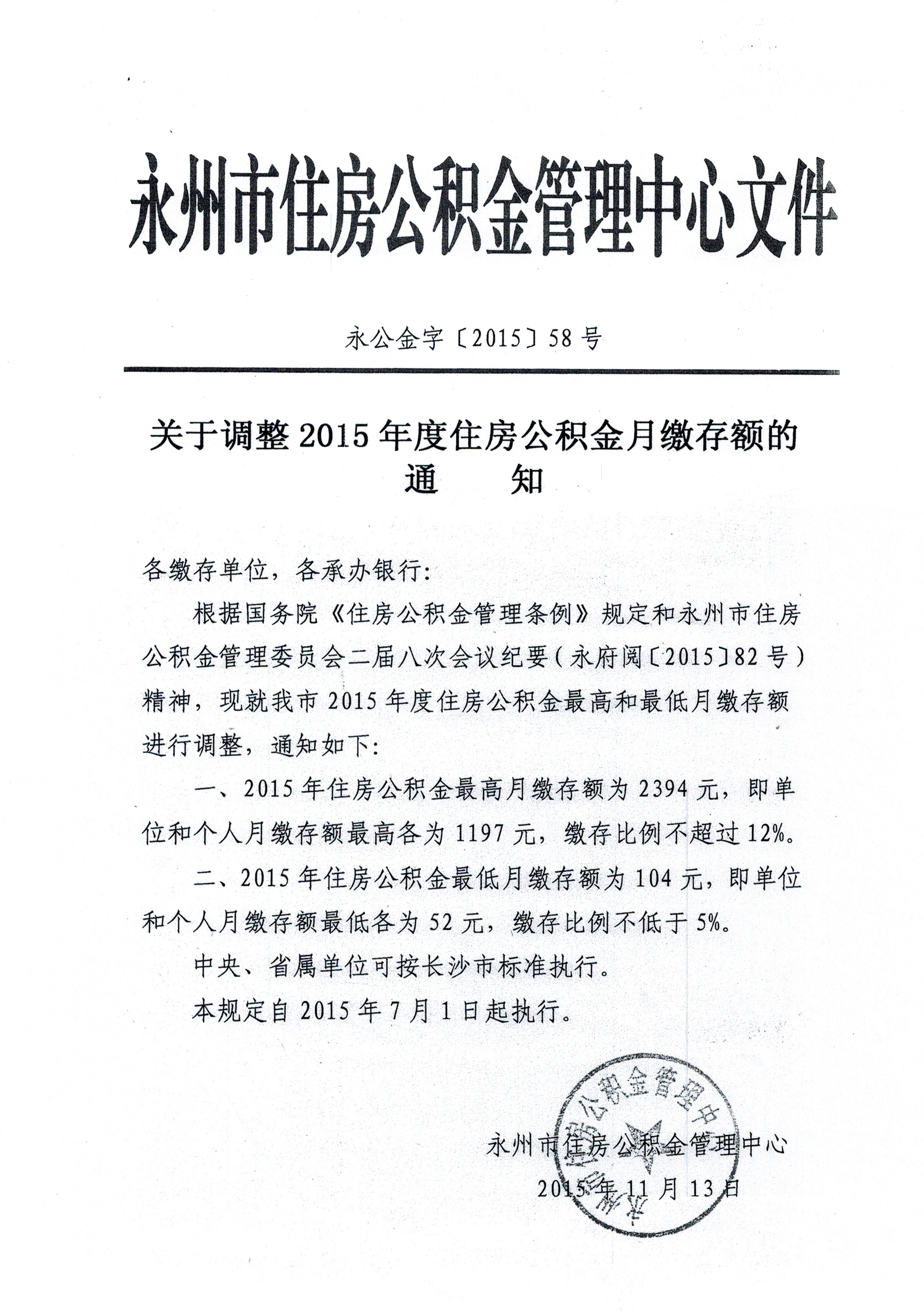 關于調整2015年度住房公積金月繳存額的通知