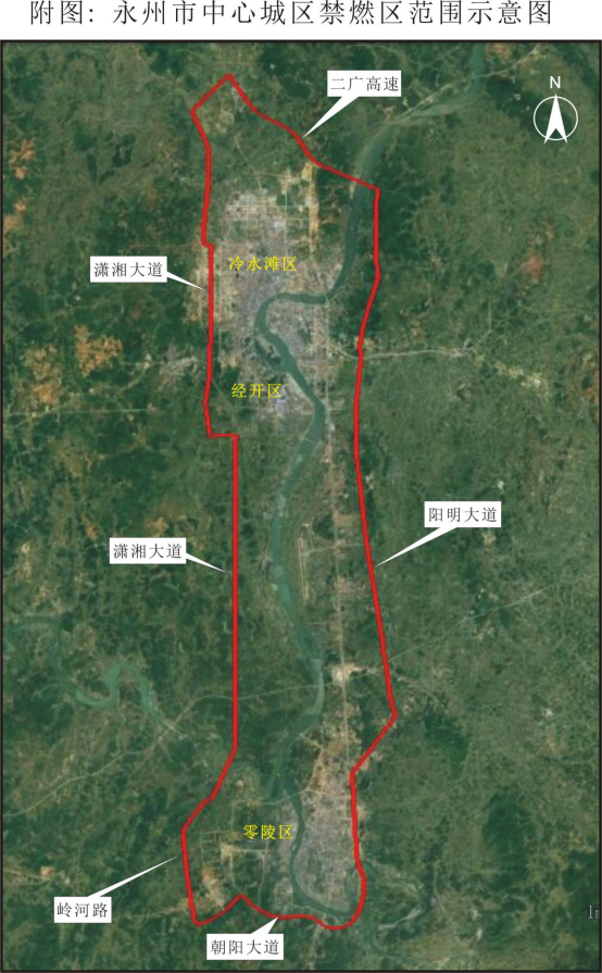 根據(jù)《永州市城市總體規(guī)劃(2010-2020)》,以遠(yuǎn)期規(guī)劃范圍為基礎(chǔ),結(jié)合中心城區(qū)實(shí)際建設(shè)狀況,確定中心城區(qū)禁燃區(qū)范圍為:東面以陽明大道為界、南面以朝陽大道為界、西面以瀟湘大道和嶺河路為界、北面以二廣高速為界的閉環(huán)區(qū)域內(nèi)。(具體范圍詳見附圖)