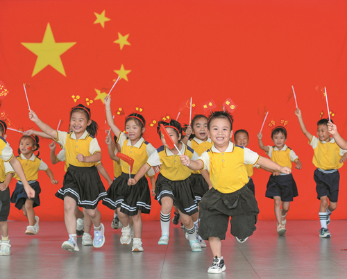 9月29日,在道縣城南幼兒園舉行的喜迎國慶活動中,孩子們揮舞國旗開心奔跑。國慶節臨近,當地開展豐富多彩的迎國慶主題活動,表達對祖國的美好祝愿。 蔣克青 黃頌 攝