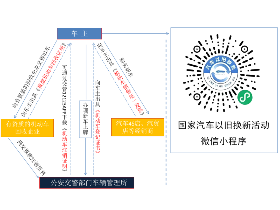 1.報(bào)廢注銷舊車,從回收企業(yè)取得《報(bào)廢機(jī)動(dòng)車回收證明》和從公安交警車輛管理所取得《機(jī)動(dòng)車注銷證明》;
