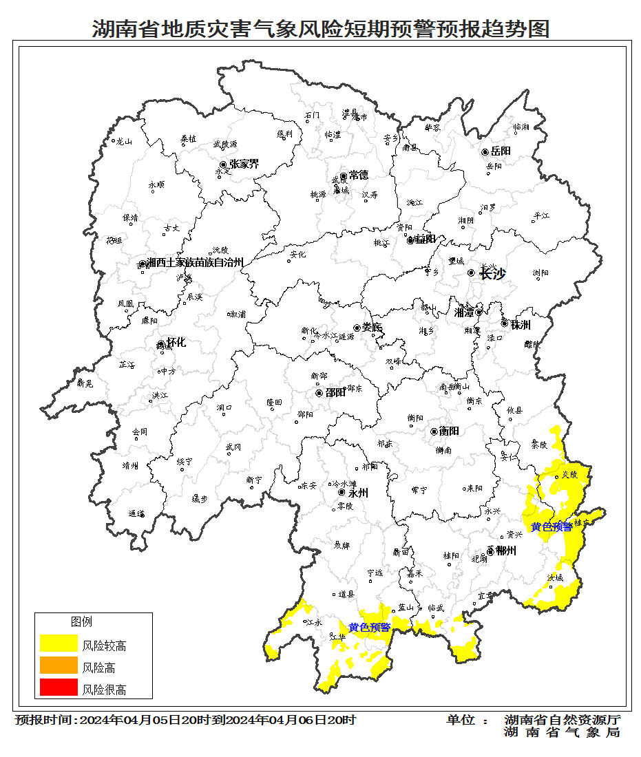 根據地質災害成災規律和孕災條件,結合2024年4月5日短期氣象預報情況,省自然資源廳與省氣象局聯合會商得出如下結論:自4月5日20:00至6日20:00,受降雨影響,湘東南、湘南大部分區域發生突發性地質災害風險較高(黃色預警)。
