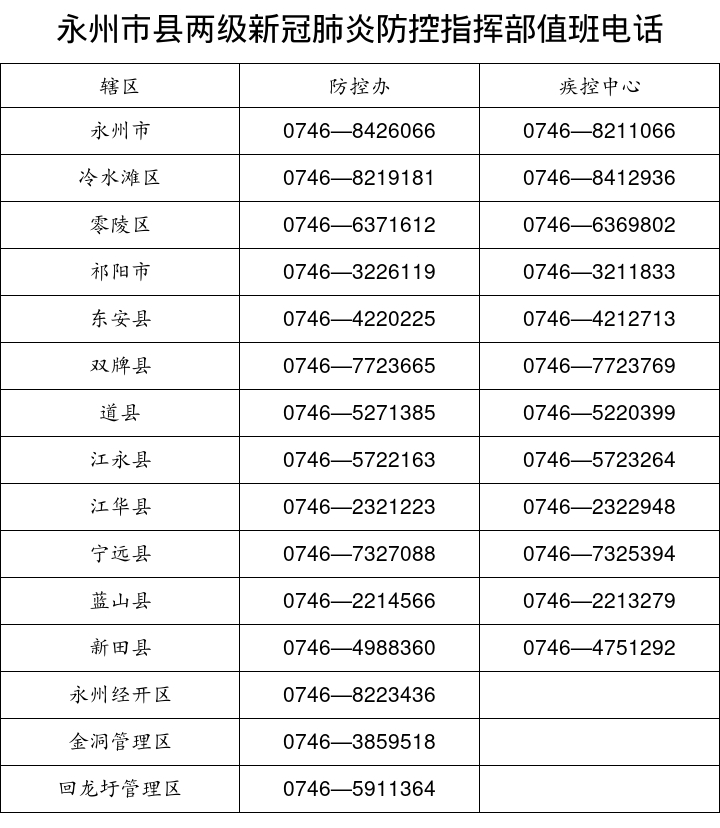 永州市縣兩級(jí)新冠肺炎防控指揮部值班電話