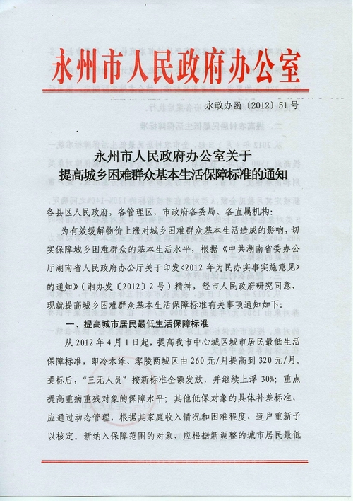 永州市人民政府辦公室關于提高城鄉困難群眾基本生活保障標準的通知