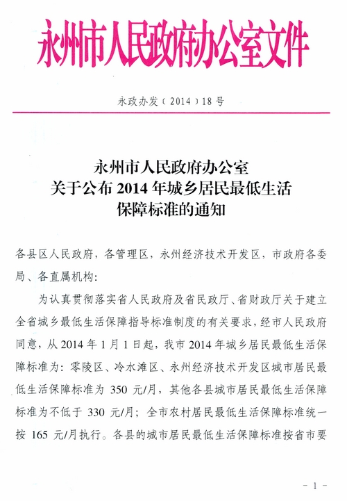 永州市人民政府辦公室關(guān)于公布2014年城鄉(xiāng)居民最低生活保障標準的通知