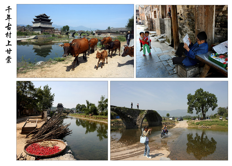 上甘棠 背靠青山,前依綠水,形成了“前有玉帶,后由靠山;左青龍,右白虎”的太極布局。謝沐河有若太極圖中劃分陰陽的人部,昂山恰似陰面的陽點,文昌閣又如陽面中的陰點。村中縱橫交錯的古巷道,門樓上的卦相標志,無不隱約透露出風水文化的玄妙神奇。