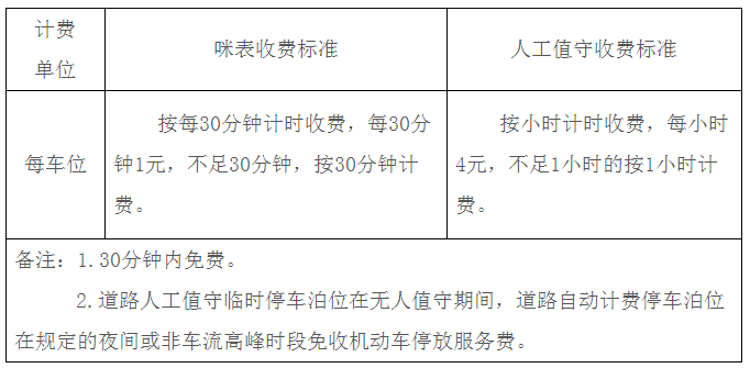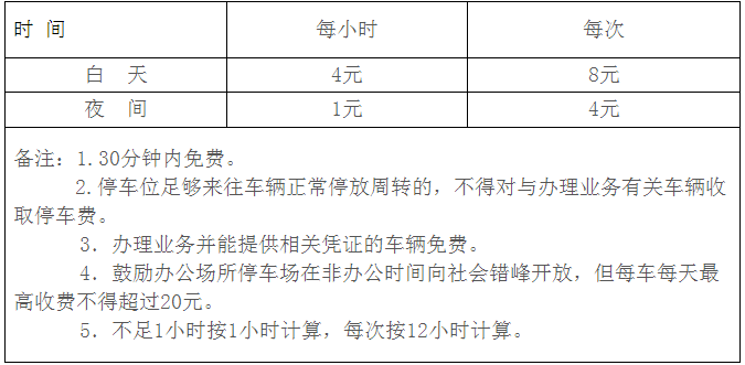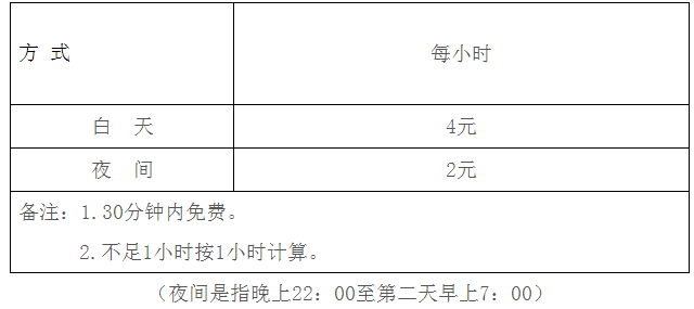 (公布的收費標準以小汽車為準,其他車型比照所占小汽車位計費,摩托車(電動車)按不超過小車標準四分之一收取。)