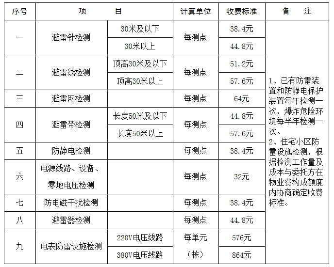 三、防雷技術服務費降低20%后的各項具體收費標準如下: