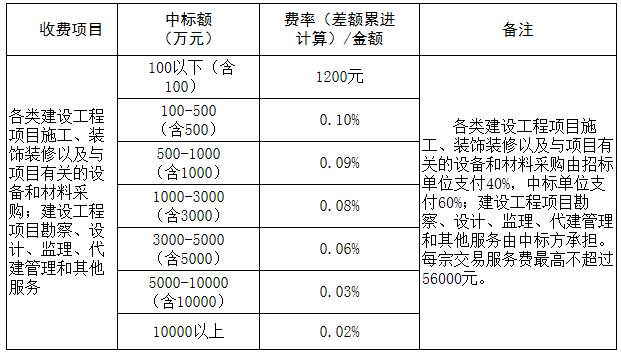 (二)為各類建設工程的勘察、設計、施工、裝飾裝修、監理、代建管理以及與工程有關的材料設備采購提供進場或網上交易服務時,執行下列收費標準: