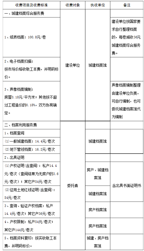 五、建設檔案利用技術服務費降低20%后的各項具體收費標準如下: