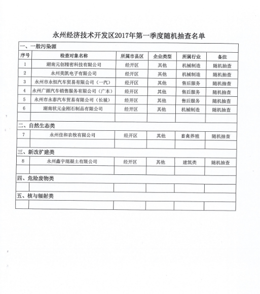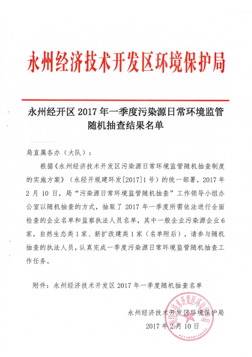 永州經開區2017年一季度污染源日常環境監管隨機抽查結果名單