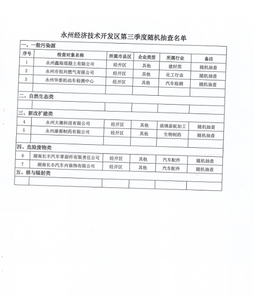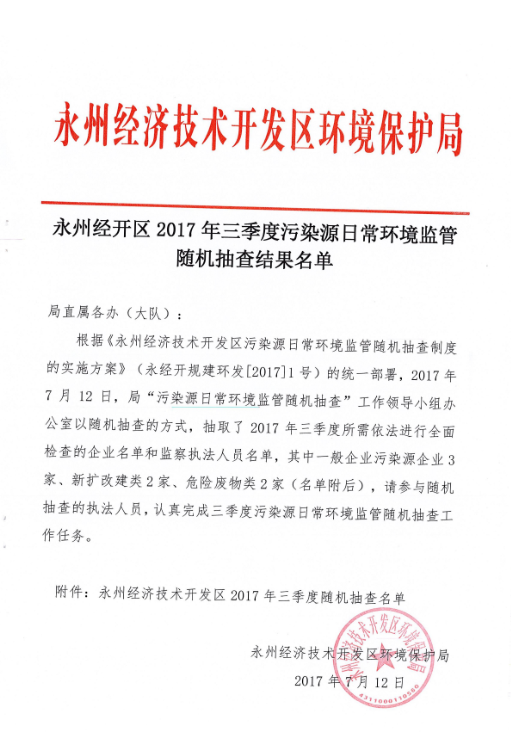 永州經開區2017年三季度污染源日常環境監管隨機抽查結果名單
