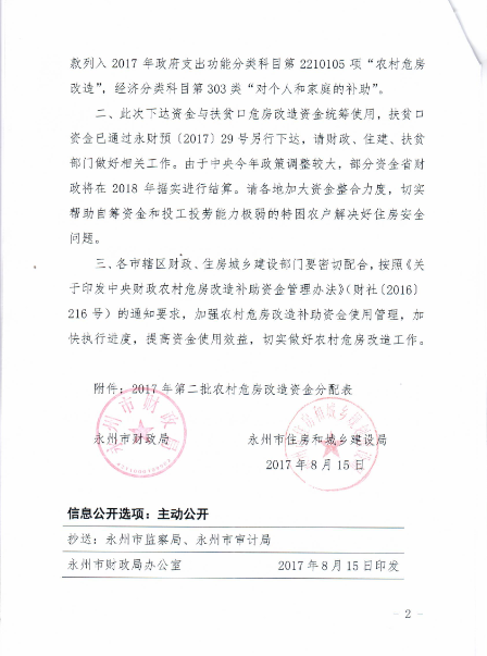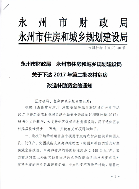 永州市財政局 永州市住房和城鄉規劃建設局關于下達2017年第二批農村危房改造補助資金的通知