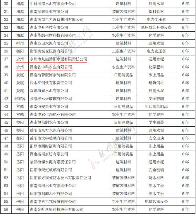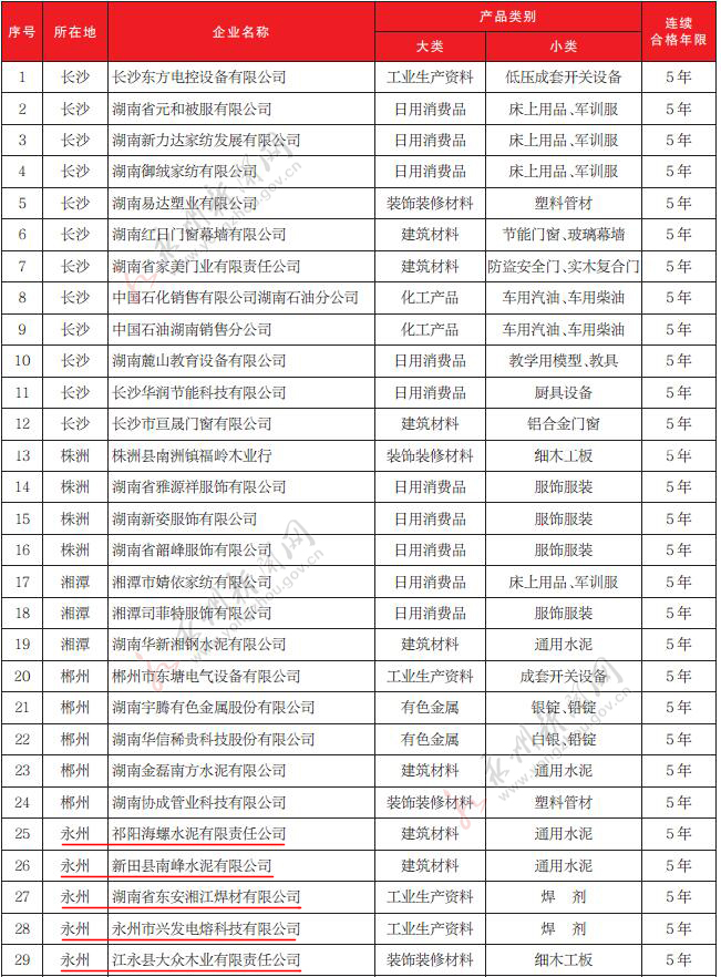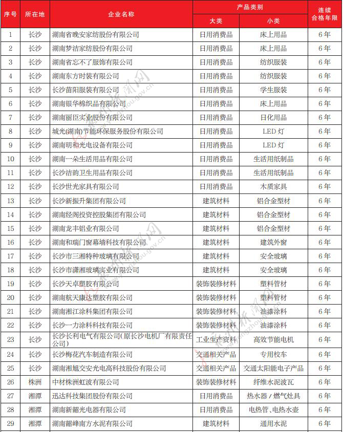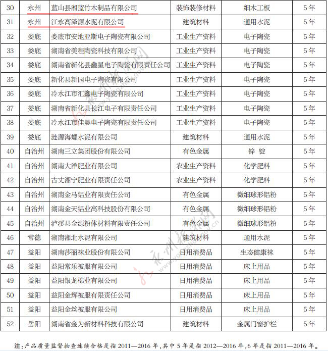 根據《中華人民共和國產品質量法》、《湖南省產品質量監督檢查辦法》有關規定的要求,為推進我省質量強省戰略,助推我省供給側結構性改革,打造湘字品牌,提升湘品形象,省質量技術監督局在國家和省級監督抽查結果的基礎上,經過企業自愿申報,省、市兩級審核等程序,確認108家企業入選2017年“產品質量監督抽查連續合格企業”,現予公布。