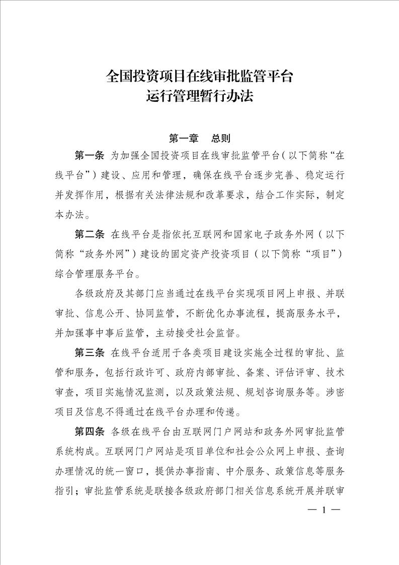 全國(guó)投資項(xiàng)目在線審批監(jiān)管平臺(tái)運(yùn)行管理暫行辦法