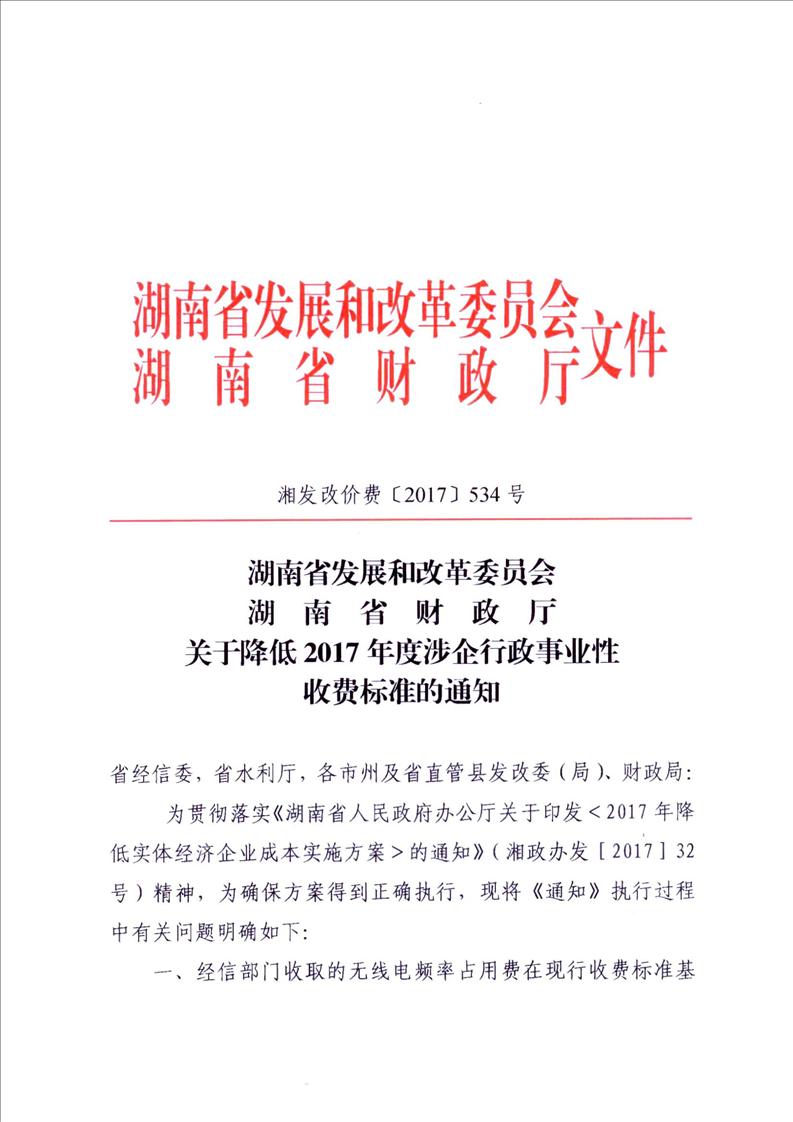 湘發(fā)改價(jià)費(fèi)〔2017〕534號(hào) 省發(fā)改委 省財(cái)政廳關(guān)于降低2017年度涉企行政事業(yè)性收費(fèi)標(biāo)準(zhǔn)的通知