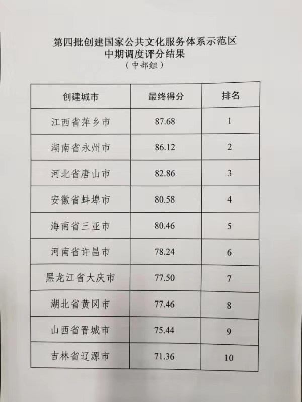 9月17-18日,國(guó)家文旅部在北京中央文化和旅游管理干部學(xué)院舉辦了第四批創(chuàng)建國(guó)家公共文化服務(wù)體系示范區(qū)(項(xiàng)目)中期調(diào)度工作培訓(xùn)班。市委常委、宣傳部長(zhǎng)、市創(chuàng)建辦主任賀輝率市創(chuàng)區(qū)工作組一行人等前往匯報(bào)創(chuàng)建工作。經(jīng)國(guó)家專(zhuān)家組打分評(píng)議,綜合前期第三方設(shè)施暗訪和群眾滿(mǎn)意度測(cè)評(píng),在河北省唐山市、山西省晉城市、吉林省遼源市、黑龍江省大慶市、安徽省蚌埠市、江西省萍鄉(xiāng)市、河南省許昌市、湖北黃岡市、海南省三亞市等中部組10個(gè)創(chuàng)建城市中,永州以排名第2的優(yōu)秀成績(jī),順利通過(guò)國(guó)家文旅部的中期調(diào)度,為明年最終驗(yàn)收達(dá)標(biāo)奠定了堅(jiān)實(shí)基礎(chǔ)。