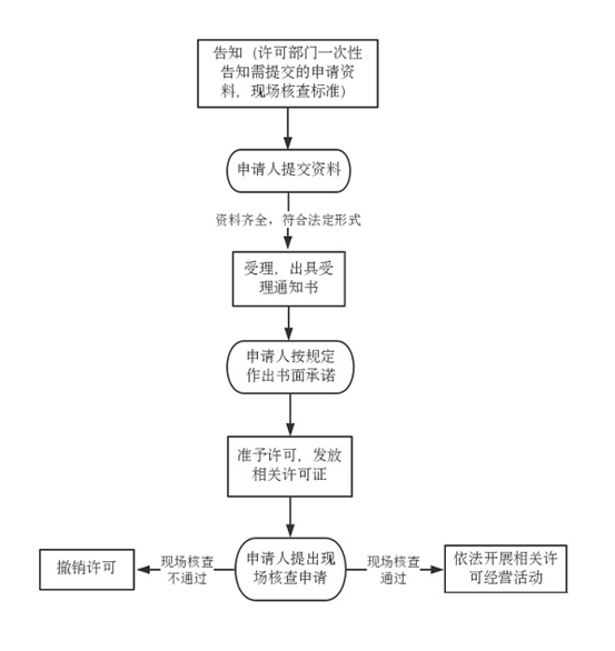 許可部門一次性告知申請人需提交的申請資料規范和現場核查標準;申請人根據告知內容提交的申請材料齊全、符合法定形式,并對材料的真實性負責,許可部門即予以受理,出具受理通知書;許可部門受理后,在申請人按規定作出書面承諾的基礎上,即可頒發相關許可證(附件2)。