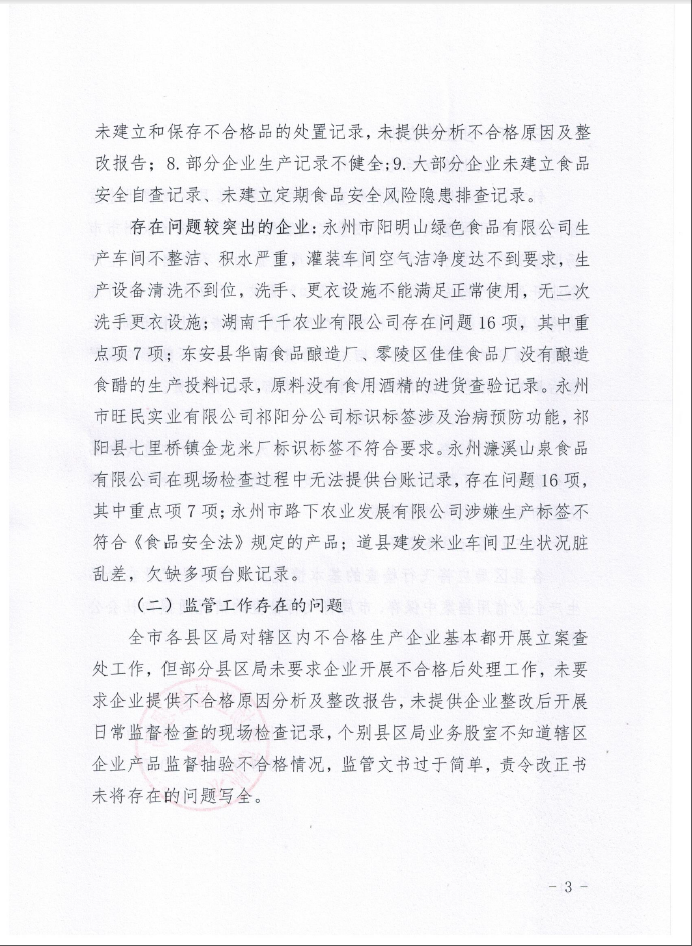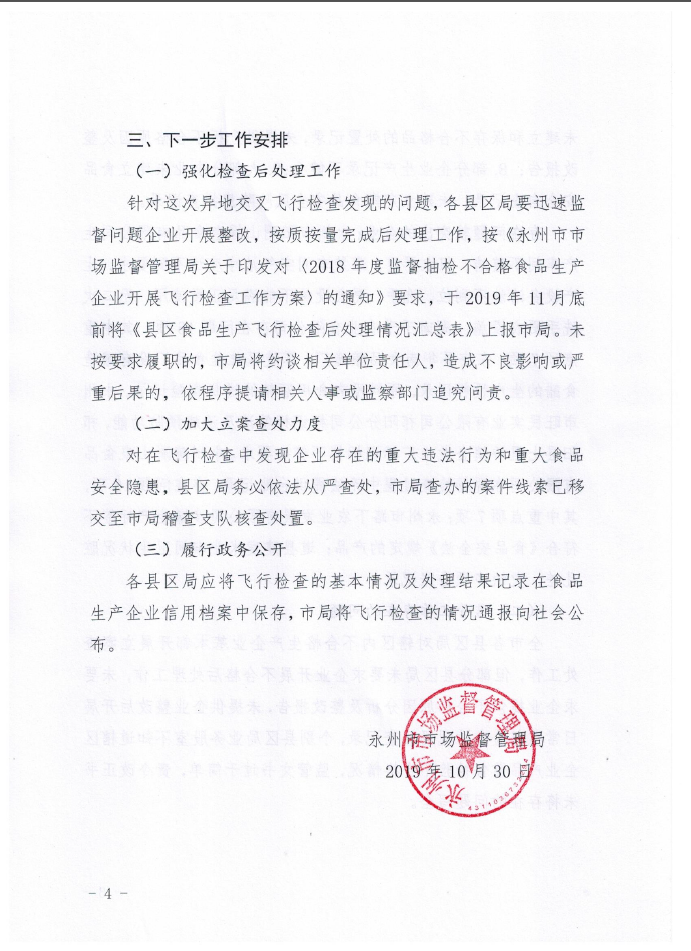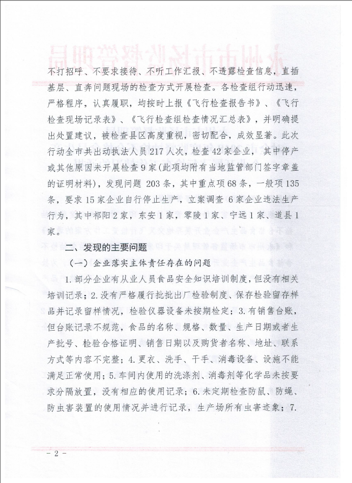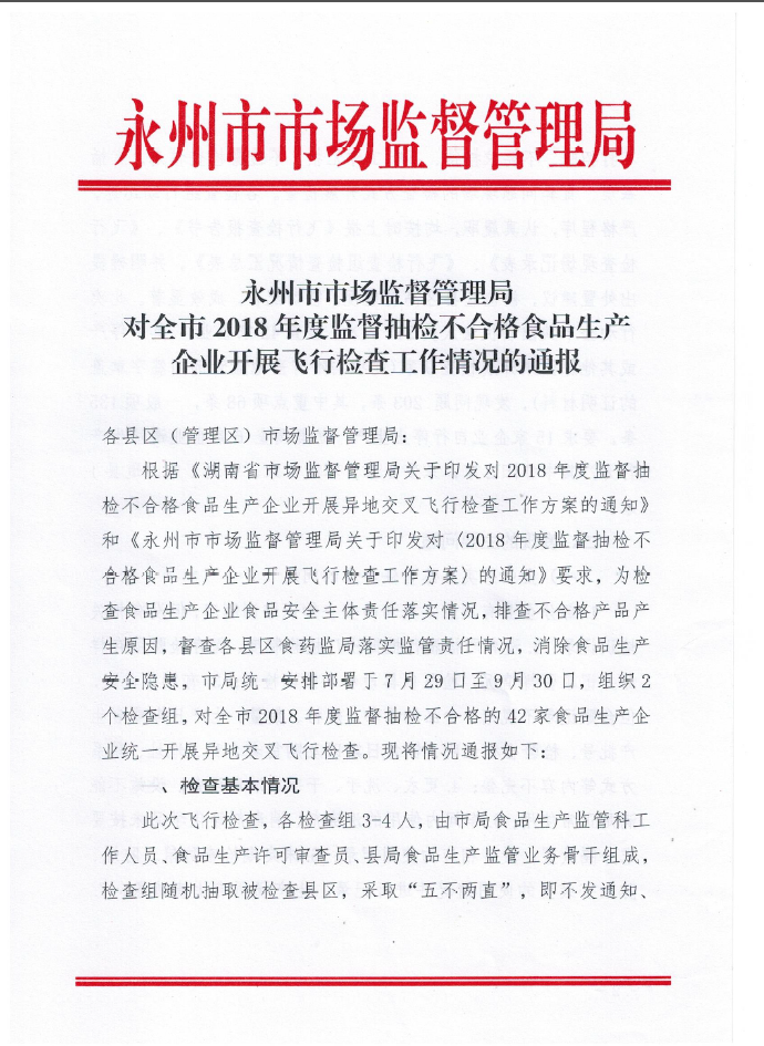 永州市市場監(jiān)督管理局對全市2018年度監(jiān)督抽檢不合格食品生產(chǎn)企業(yè)開展飛行檢查工作情況的通報